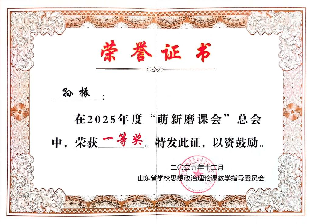 近日,2025年度山东高校思想政治理论课“萌新磨课总会”在青岛落下帷幕,马克思主义学院院长助理、思政系主任孙振老师荣获一等奖,实现了我校在该项赛事的历史性突破。