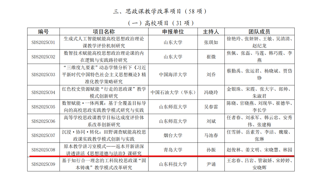 近日,山东省教育厅正式公布2025年山东省思想政治教育教学改革项目立项名单。我院孙振老师主持申报的《原本教学讲习室模式——返本开新讲深讲透讲活〈思想道德与法治〉课研究》,入选思政课教学改革项目。这标志着学院在深化思政课改革创新、提升铸魂育人实效方面取得了重要阶段性成果。